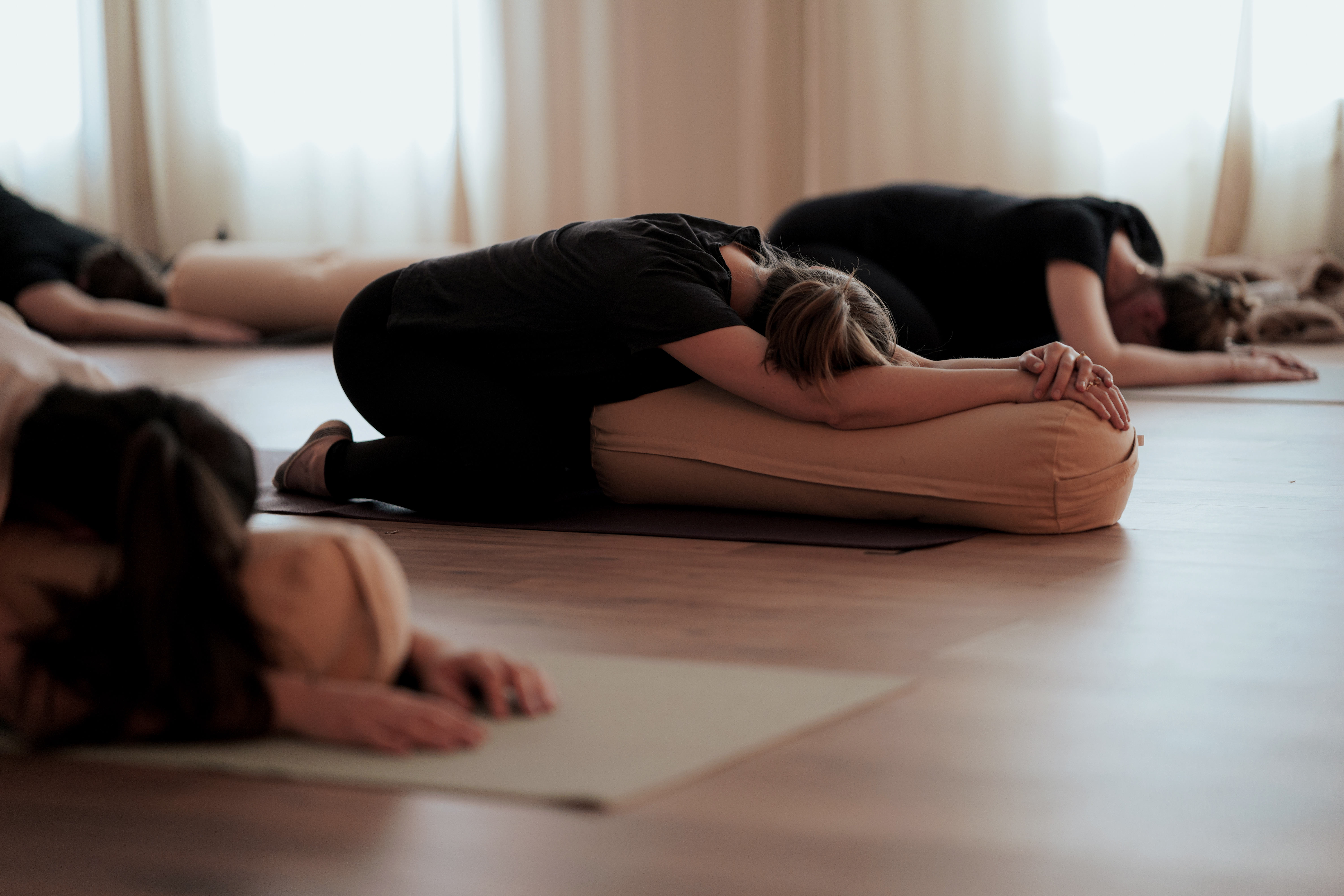 Vi har yogamattor, filtar och bolster på plats.